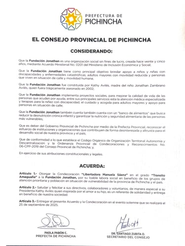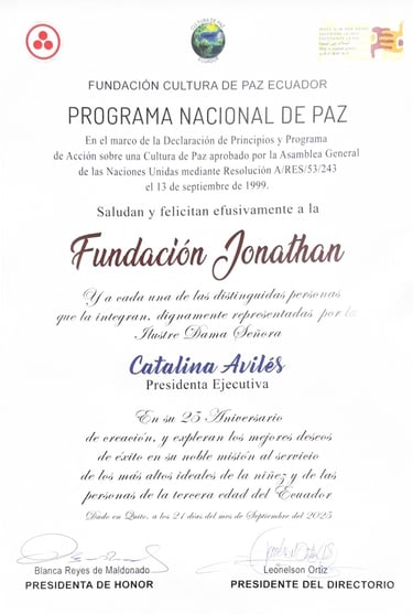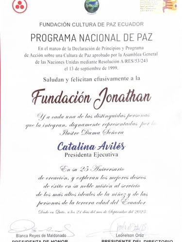 Otorgado por Fundación Cultura de Paz Ecuador en los 25 años de Fundación.