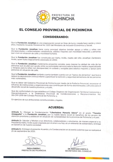 Otorgado por Prefectura de Pichincha por los 25 años de aniversario.