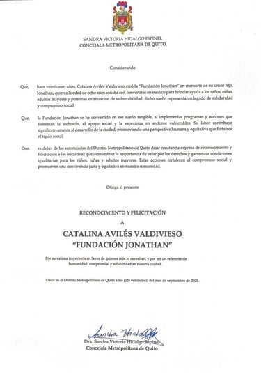 Awarded by the Pichincha Prefecture for the 25th anniversary.