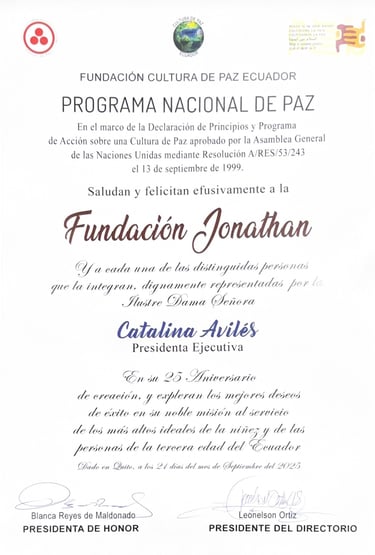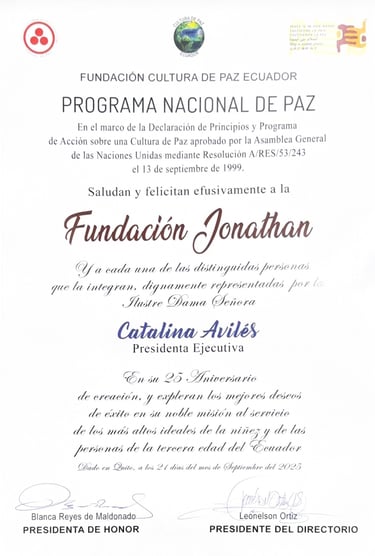 Awarded by the Culture of Peace Foundation of Ecuador on its 25th anniversary.