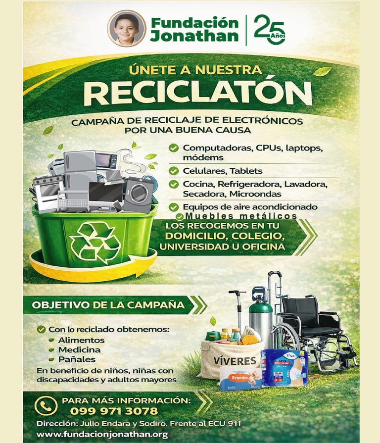 En la Fundación Jonathan, estamos comprometidos con las personas de atención prioritaria en estado de vulnerabilidad en Ecuador. Para seguir apoyando a quienes más lo necesitan, impulzamos nuestra campaña Reciclatón.